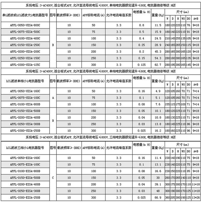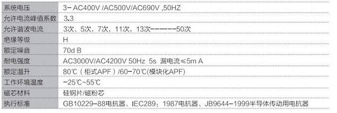6脉冲滤波APF(10KHZ)连接电抗器技术参数: