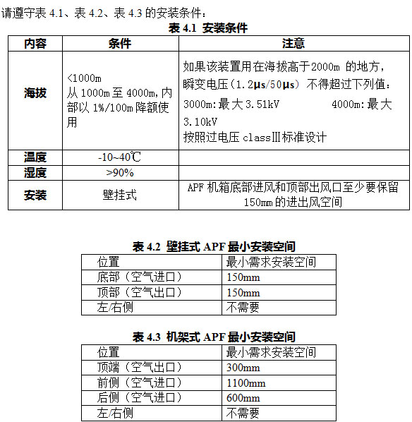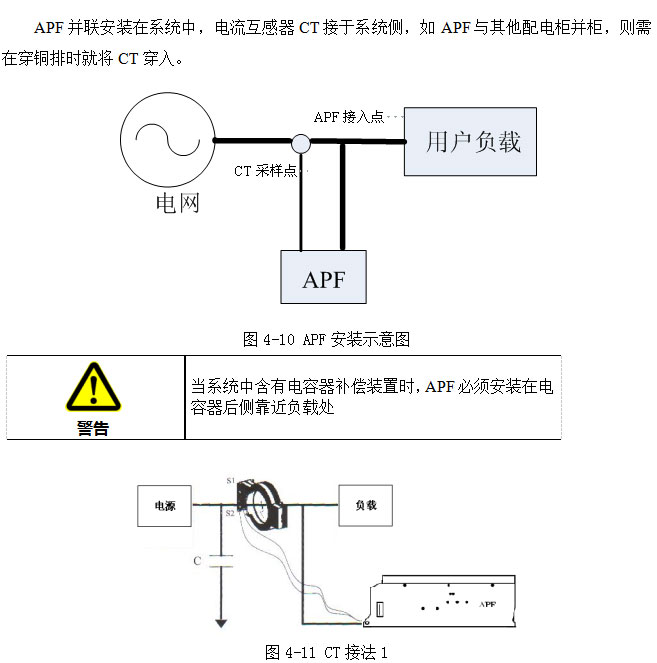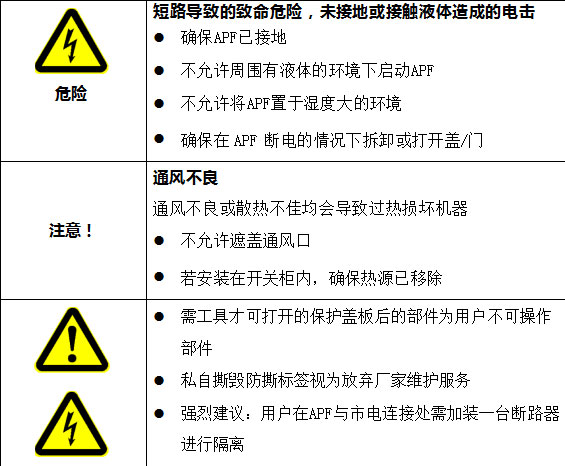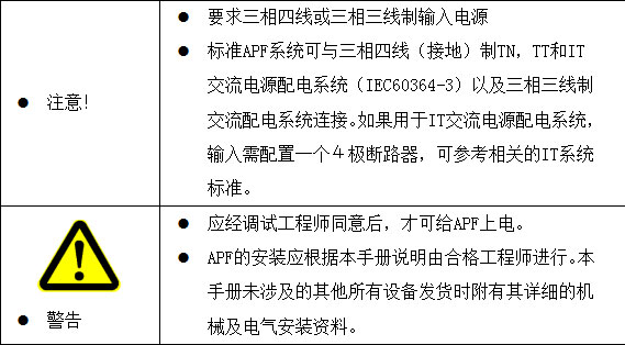 【注】:APF装置的电气部分的安装必须由经过培训的合格工程师依据“电工法则”进行,严禁其他人员违规进行安装,本手册只介绍安装的基本内容,具体安装细节请参考电工规范。