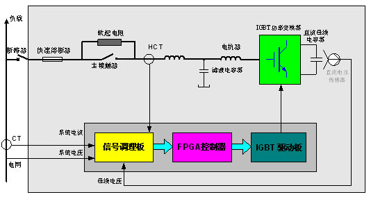 如图2-2所示,隔离开关合闸后,为防止上电后电网对直流母线电容器的瞬间冲击,ZLDL-APF首先通过软起电阻对直流母线的电容器充电,这个过程会持续几十秒。当母线电压Udc达到预定值后,主接触器闭合。直流电容作为储能器件,通过IGBT逆变器和内部电抗器向外输出补偿电流提供能量。ZLDL-APF通过外部CT实时采集电流信号送至信号调理电路,然后再送至FPGA控制器。控制器将基波成分分离,提取出所有的谐波,将采集到的谐波成分和ZLDL-APF已发出的补偿电流比较得到差值作为实时补偿信号输出到驱动电路,触发IGBT变换器将补偿谐波电流注入到电网中,实现滤除谐波的功能。