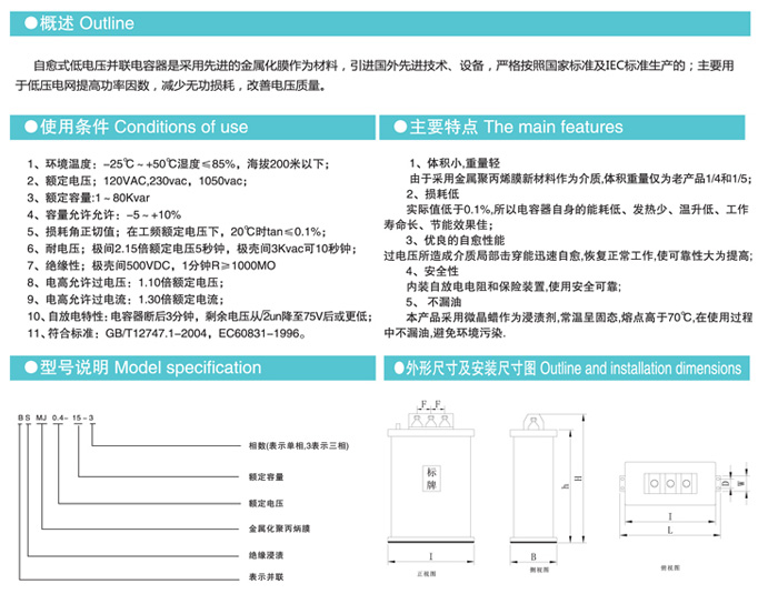 5.用小型断路器作短路保护时,应按电容器额定电流2-3 倍选择,严禁断路6.电容器从电源切除后一定要保证电容器剩余电压降至10% 额定电压才允许再次投入