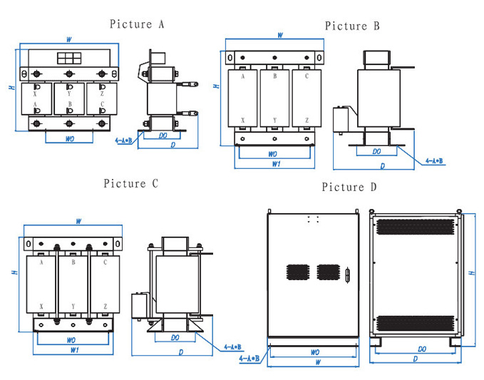 备注:产品标示A、B、C为滤波器三相输入端,X、Y、Z为滤波器三相输出端,L、N为220V风机电源接线端。