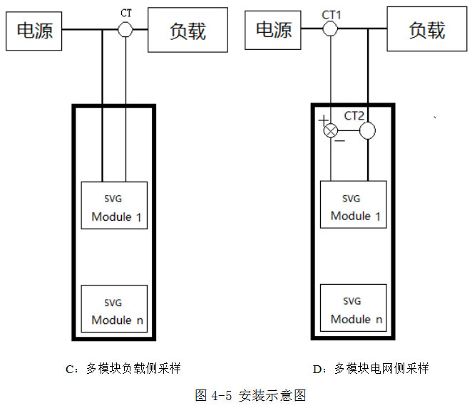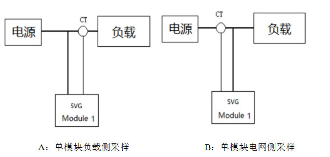 SVG并联安装在系统中,电流互感器CT可在触摸屏上任选接于电网侧或负载侧,默认是选择负载侧安装,如果现场为采样电网侧的话,多模块并联的机柜内需要将电网CT信号与装置输出总电流CT信号相减得到负载侧电流,作为采样信号输入到??槟?。共有如下接线方式: