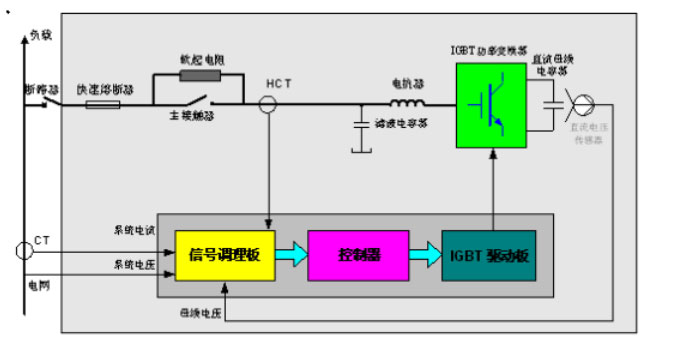 如图2-2所示,隔离开关合闸后,为防止上电时电网对直流母线电容器的瞬间冲击, SVG首先通过软起电阻对直流母线的电容器充电,这个过程会持续几十秒。当母线电压Udc达到预定值后,主接触器闭合。直流电容作为储能器件,通过IGBT逆变器和内部电抗器向外输出补偿电流提供能量。SVG通过外部CT实时采集电流信号送至信号调理电路,然后再送至控制器??刂破鹘ǔ煞址掷?,提取出所有的谐波电流、无功电流、三相不平衡电流,将采集到的要补偿的电流成分和SVG已发出的补偿电流比较得到差值,作为实时补偿信号输出到驱动电路,触发IGBT变换器将补偿电流注入到电网中,实现闭环控制,完成补偿功能。