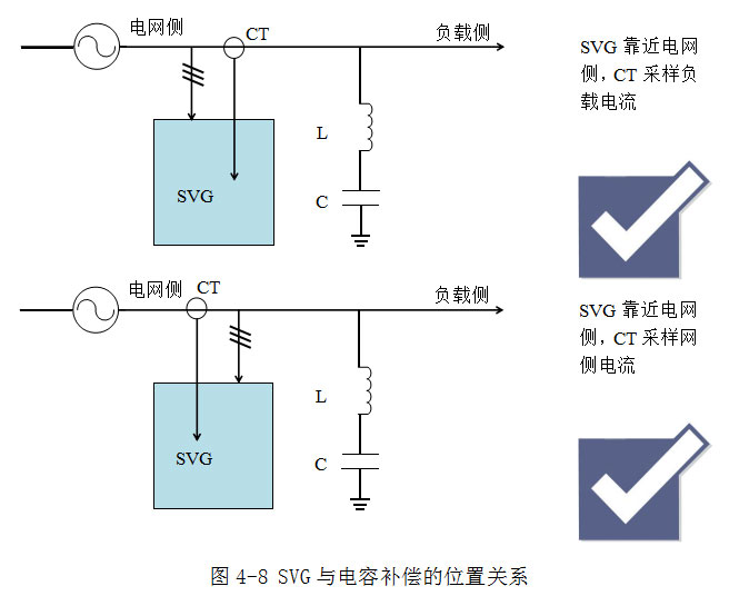 电网,原因是SVG补偿无功,但由于电容成本更低,所以一般是电容器补偿大部分无功,SVG补偿剩余无功,只有SVG的CT检测点更靠近电网侧,SVG才能检测出剩余无功。