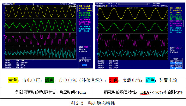 黄色:市电电压;绿色:市电电流(补偿目标);红色:负载电流;蓝色:装置电流